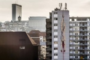 “Hellish and awful,” Nicole Brisard grumbled as she walked her dog, Max, past the bleeding corpse rendered in paint on seven stories of a low-rent apartment building. “And all we wish for is to have something better, out of respect for the people.”